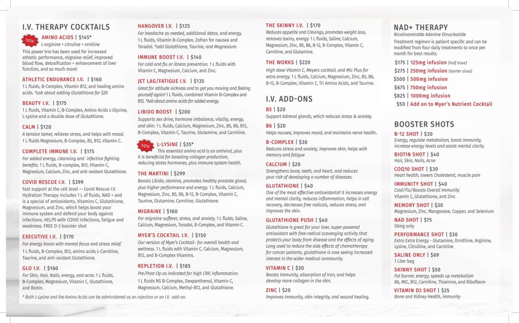 Myer’s Cocktail IV: Our version of Myers cocktail – for overall health and wellness. 1 L fluids with vitamin C, magnesium, calcium, B12, and B complex vitamins.
