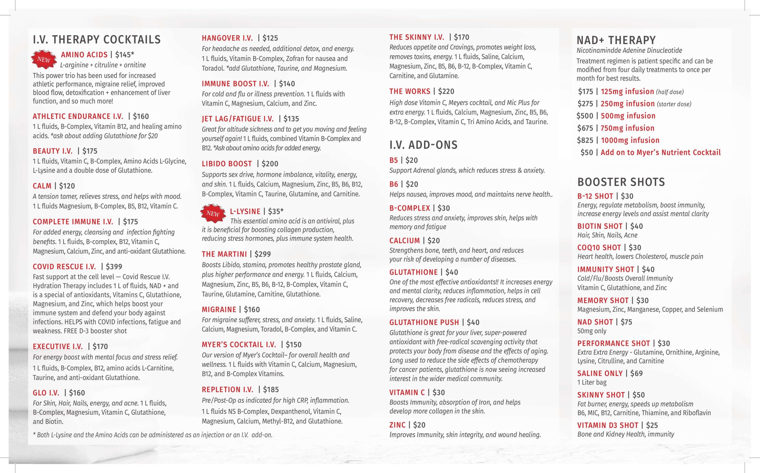 Executive IV: Boosts energy and mental focus and provides stress relief. Includes hydrating fluids, B complex, B12, amino acids, L-carnitine, taurine, and the antioxidant glutathione.